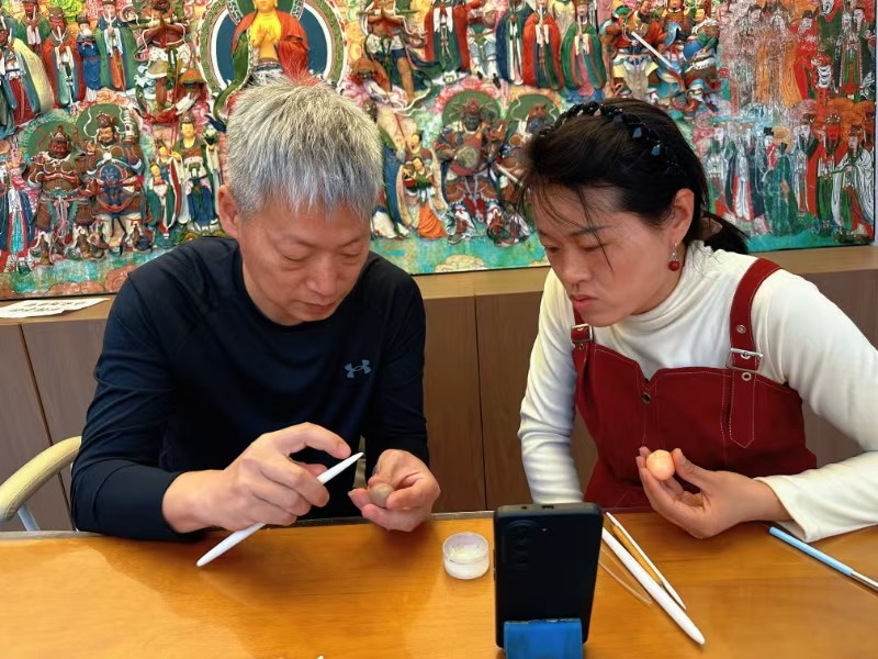 “在這條街上,聚集了很多和我一樣的手藝人?!贝蠛C嫠芩诘年P帝廟北巷文創(chuàng)街上,一家家非遺店鋪林立——葫蘆烙畫店鋪內(nèi),忻州市忻府區(qū)葫蘆烙畫非物質(zhì)文化遺產(chǎn)代表性傳承人李云珍正手拿烙鐵在葫蘆上創(chuàng)作《八駿圖》;“草木染”非遺體驗店里,有游客在體驗扎染的樂趣;鋦藝里,游客圍在忻州市忻府區(qū)鋦瓷藝術(shù)非物質(zhì)文化遺產(chǎn)代表性傳承人王克劍身邊,看一件破碎的瓷器如何經(jīng)過他的雙手重生……