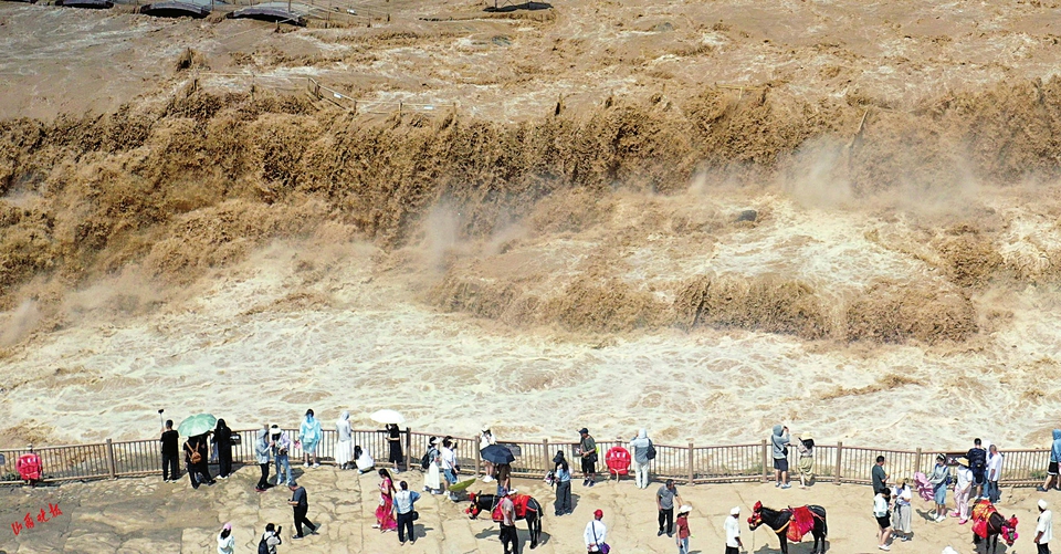近日,受上游降雨增多及萬(wàn)家寨水庫(kù)調(diào)水調(diào)沙放水影響,黃河干流進(jìn)入汛期。位于晉陜兩省交界處的壺口瀑布水量驟增,每秒流量突破1800立方米,主瀑與副瀑連成壯闊一線,昔日分散的水流此刻匯聚成氣勢(shì)磅礴的瀑布群,盡顯“黃河之水天上來(lái)”的雄渾壯美。這一難得的景觀吸引了大批游客慕名而至,爭(zhēng)相目睹大自然的磅礴奇觀。