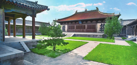 永安寺,原稱渾源州永安禪寺及神州大永安禪寺,俗稱“大寺”,始建于金,金元之交被火毀后重建,明、清以來均曾在當(dāng)?shù)毓賳T倡導(dǎo)下續(xù)建與增修。該寺位于渾源古城東北隅,坐西北朝東南,本為以中軸線為主,東西軸各輔以跨院或偏院的五進(jìn)場院空間大型寺廟建筑群,現(xiàn)僅存前院及東西跨院和中院主體建筑群,東西寬52米,南北深78米,占地面積4056平方米。寺內(nèi)現(xiàn)存文物建筑物7座、清代壁畫305.4平方米、建筑彩畫2118平方米,古代碑碣2方,石獅一對。主殿傳法正宗殿為元延祐二年(1315年)原構(gòu),是我國建筑史上廡殿頂建筑的杰作,殿內(nèi)滿堂水陸畫、建筑彩畫及殿頂五彩琉璃均保存完好且異常精美,聞名遐邇。