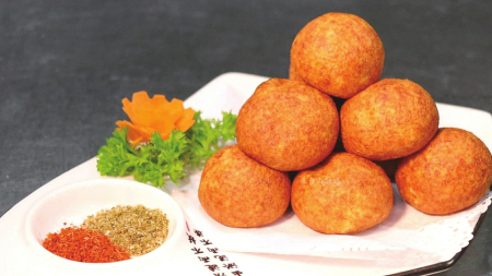 豆腐丸子精選五臺(tái)山鹵水豆腐,擠出多余水分,壓成細(xì)膩豆腐碎,加入佐料攪拌,揉成圓潤緊實(shí)的丸子,蒸制后在麥芽糖水中定型再開炸,外衣漸鍍“金甲”,內(nèi)里卻保持著豆腐的柔嫩本味。