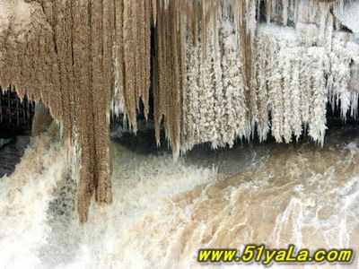 由于四季氣候和水量的差異,壺口景色也時(shí)有所變。壺口的春秋兩季,景象也甚為奇特,有氣為虹,橫浮水上,形成了“岸旁無虹掛長雨”的景觀。春回大地的時(shí)候,漫山遍野的山桃花盛開,黃河冰岸消融,水量適度平穩(wěn),主瀑、副瀑連成一片,看主瀑云霧迷蒙,望副瀑萬壑千流,觀“龍槽”如巨龍掀浪,稱為“三月桃花汛”;秋季9-11月份雨季剛過去時(shí),河邊眾多山泉小溪,匯集大量清流,陣陣秋風(fēng)吹過,常有彩虹出現(xiàn),叫做“壺口秋風(fēng)”。明陳維藩《壺口秋風(fēng)》詩有“秋風(fēng)卷起千層浪,晚日迎來萬丈紅”句,可謂真實(shí)寫照。這兩個(gè)時(shí)期,水大而穩(wěn),瀑布寬度可達(dá)千米左右。主瀑難以接近,但遠(yuǎn)遠(yuǎn)望去,煙波浩淼,威武雄壯。大浪卷著水泡,奔騰咆哮,以翻江倒海之勢,飛流而下。壺口的冬日,又是一種奇觀:壺口兩側(cè),冰簾垂掛,晶瑩剔透,格外誘人,農(nóng)歷小雪,大雪前后,上游漂流下來的大冰塊,落入壺口平緩處,冰塊相交,冰峰凍結(jié),冰橋天然合成,人履冰橋,如走坦途,人們稱為“壺口叉橋”。在天橋村附近,積冰成橋,冰橋下激流滾滾,濤聲大作,人們稱之為“天橋”。