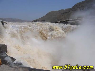 壺口瀑布位于吉縣城西45公里、距臨汾市165公里處的晉陜峽谷黃河河床中,為世界上最大的黃色瀑布,因其氣勢雄渾而享譽(yù)中外。此地兩岸夾山,河底石巖上沖刷成一巨溝,寬達(dá)30米,深約50米,滾滾黃水奔流至此,倒懸傾注,若奔馬直入河溝,波浪翻滾,驚濤怒吼,震聲數(shù)里可聞。其形如巨壺沸騰,故名。黃河浪濤激起一團(tuán)團(tuán)霧煙云隨著水霧的升高,煙云由黃變灰、由灰變藍(lán),景色奇麗,有“水底生煙”之說。壺口瀑布不僅有“水底冒煙”,“彩橋通天”奇景,更有“旱地行船”之說。上游船只到此,必須離水登陸,經(jīng)人抬或車運(yùn)繞過壺口(即所謂“旱地行船”)方可入水續(xù)航,千百年來,概莫能變。