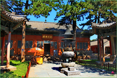 顯通寺的大雄寶殿為舉行佛事活動(dòng)主要場(chǎng)所,是顯通寺的第三重大殿,殿內(nèi)供著三尊佛像:中是釋迦牟尼佛,西是阿彌陀佛,東是藥師佛;兩旁有十八羅漢像背后有觀(guān)音、文殊、普賢三尊菩薩像。觀(guān)音殿殿內(nèi),中間供著觀(guān)音菩薩像,左右供著文殊和普賢菩薩像。大文殊殿,是顯通寺的第二重大殿。大文殊殿內(nèi),供著七尊文殊菩薩像:正中的為大智文殊;前面的五位,從左至右,依次為西臺(tái)獅子文殊,南臺(tái)智慧文殊,中臺(tái)孺者文殊,北臺(tái)無(wú)垢文殊,東臺(tái)聰明文殊;大智文殊后面是甘露文殊。文殊像前有護(hù)法神韋馱像,兩側(cè)有十八羅漢像。