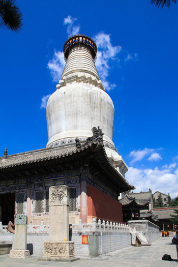 塔全稱為釋迦牟尼舍利塔,俗稱大白塔。塔身撥地而起凌空高聳,在五臺(tái)山群寺簇?fù)碇骂H為壯觀,人們把它做為五臺(tái)山的標(biāo)志。此塔通高七十五點(diǎn)三米,環(huán)周八十三點(diǎn)三米。塔基為正方形,塔身狀如藻瓶,粗細(xì)相間,方圓搭配,造型優(yōu)美。塔頂蓋銅板八塊成圓形,按乾、坎、艮、震、巽、離、坤、兌等八卦地位安置。塔頂中裝銅頂一枚,高約五米,覆盤二十一米多,飾有垂檐三十六塊,長兩米多;每塊垂檐底端掛風(fēng)鐘三個(gè),連同塔腰風(fēng)鐘在內(nèi),全塔共有二百五十二個(gè)。風(fēng)歡鈴動(dòng),叮鐺作響。