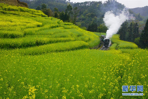 3月19日,一輛小火車從樂山市嘉陽鎮(zhèn)的油菜花田中駛過。早春時節(jié),四川省樂山市嘉陽鎮(zhèn)的油菜花競相綻放,一派春意盎然的景象。 新華社發(fā)(張偉 攝)