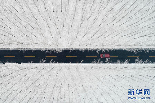12月11日,一輛汽車在山東省棗莊市臺兒莊區(qū)濤溝河濕地的道路上行進。 當日,受低溫天氣影響,山東省棗莊市迎來降雪。 新華社發(fā)(高啟民 攝)