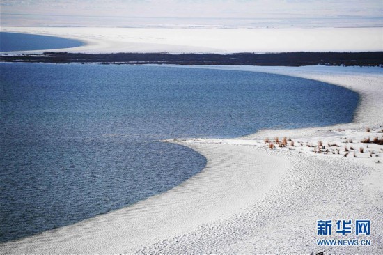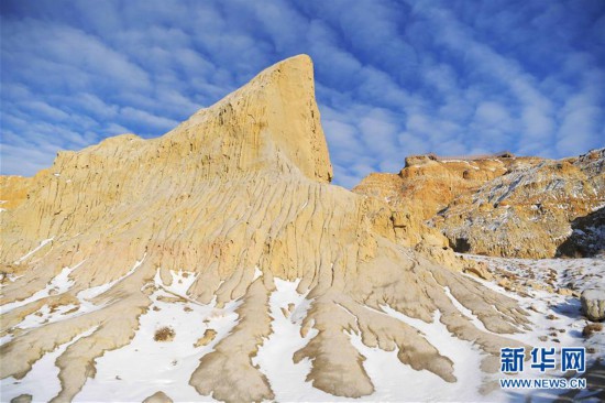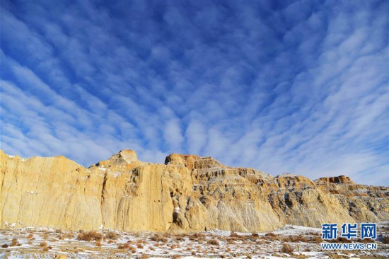 11月26日拍攝的新疆福??h烏倫古湖海上魔鬼城景區(qū)美景。 福海縣烏倫古湖海上魔鬼城景區(qū)位于新疆阿勒泰地區(qū)福??h吉力湖東岸,有著獨(dú)特的雅丹地貌和水域景觀,是當(dāng)?shù)刂穆糜蝿俚亍?新華社記者 沙達(dá)提 攝