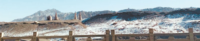 敦煌莫高窟前臨宕泉河,南西北三面呈環(huán)形,似懷抱,東面三危山高聳。晚餐后,記者走在宕泉河岸邊公路上,舉目遠眺,潔白的大雪讓莫高窟純凈晶瑩、透亮明媚,也讓人心境澄澈,如段文杰所言:一畫入眼中,萬事離心頭。(董洪亮)