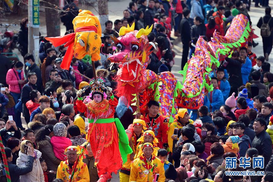 2月21日,社火隊在進(jìn)行巡游拜年。當(dāng)日,有著千年歷史的傳統(tǒng)村落——山東省章丘市三德范村組織31個社火隊舉行社火巡游拜年活動,在元宵佳節(jié)來臨之際為鄉(xiāng)親們送祝福。新華社記者 郭緒雷攝