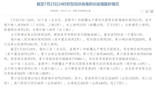 情況表示,截至7月23日24時,據(jù)31個?。ㄗ灾螀^(qū)、直轄市)和新疆生產(chǎn)建設(shè)兵團(tuán)報告,現(xiàn)有確診病例243例(其中重癥病例12例),累計治愈出院病例78873例,累計死亡病例4634例,累計報告確診病例83750例,現(xiàn)有疑似病例2例。累計追蹤到密切接觸者773802人,尚在醫(yī)學(xué)觀察的密切接觸者7526人。