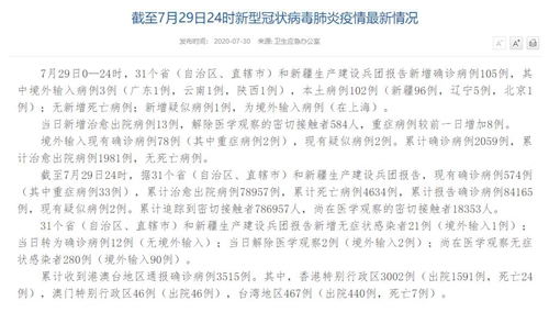 情況顯示,截至7月29日24時,據(jù)31個?。ㄗ灾螀^(qū)、直轄市)和新疆生產(chǎn)建設(shè)兵團報告,現(xiàn)有確診病例574例(其中重癥病例33例),累計治愈出院病例78957例,累計死亡病例4634例,累計報告確診病例84165例,現(xiàn)有疑似病例2例。累計追蹤到密切接觸者786957人,尚在醫(yī)學(xué)觀察的密切接觸者18353人。