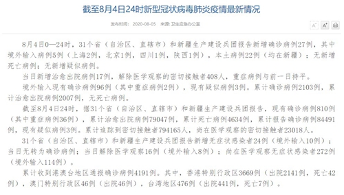| 國家衛(wèi)健委:8月4日新增確診病例27例 其中本土病例22例 |