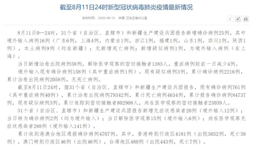| 國家衛(wèi)健委:8月11日新增確診病例25例 其中本土病例9例 |