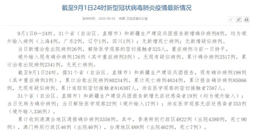 截至9月1日24時,據(jù)31個?。ㄗ灾螀^(qū)、直轄市)和新疆生產(chǎn)建設(shè)兵團報告,現(xiàn)有確診病例198例(其中重癥病例3例),累計治愈出院病例80234例,累計死亡病例4634例,累計報告確診病例85066例,無現(xiàn)有疑似病例。累計追蹤到密切接觸者816307人,尚在醫(yī)學觀察的密切接觸者7587人。