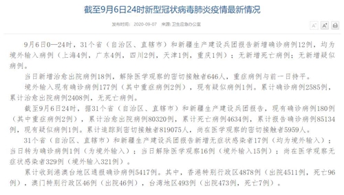 人民網(wǎng)北京9月7日電(董童)國(guó)家衛(wèi)生健康委于今日在官網(wǎng)發(fā)布的《截至9月6日24時(shí)新型冠狀病毒肺炎疫情最新情況》(以下簡(jiǎn)稱(chēng)“情況”)提出,9月6日0—24時(shí),31個(gè)?。ㄗ灾螀^(qū)、直轄市)和新疆生產(chǎn)建設(shè)兵團(tuán)報(bào)告新增確診病例12例,均為境外輸入病例(上海4例,廣東4例,四川2例,天津1例,重慶1例);無(wú)新增死亡病例;無(wú)新增疑似病例。當(dāng)日新增治愈出院病例18例,解除醫(yī)學(xué)觀察的密切接觸者646人,重癥病例與前一日持平。