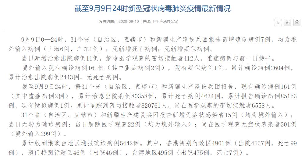 | 國(guó)家衛(wèi)健委:9月9日新增確診病例7例 均為境外輸入病例 |