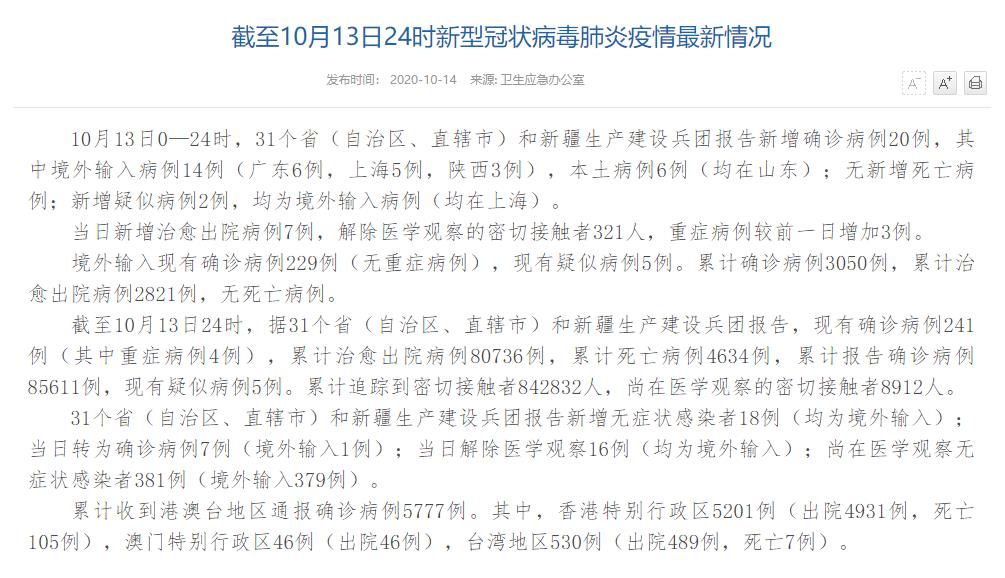 人民網(wǎng)北京10月14日電(董童)國家衛(wèi)生健康委于今日在官網(wǎng)發(fā)布的《截至10月13日24時新型冠狀病毒肺炎疫情最新情況》(以下簡稱“情況”)稱,10月13日0—24時,31個?。ㄗ灾螀^(qū)、直轄市)和新疆生產(chǎn)建設(shè)兵團(tuán)報(bào)告新增確診病例20例,其中境外輸入病例14例(廣東6例,上海5例,陜西3例),本土病例6例(均在山東);無新增死亡病例;新增疑似病例2例,均為境外輸入病例(均在上海)。當(dāng)日新增治愈出院病例7例,解除醫(yī)學(xué)觀察的密切接觸者321人,重癥病例較前一日增加3例。