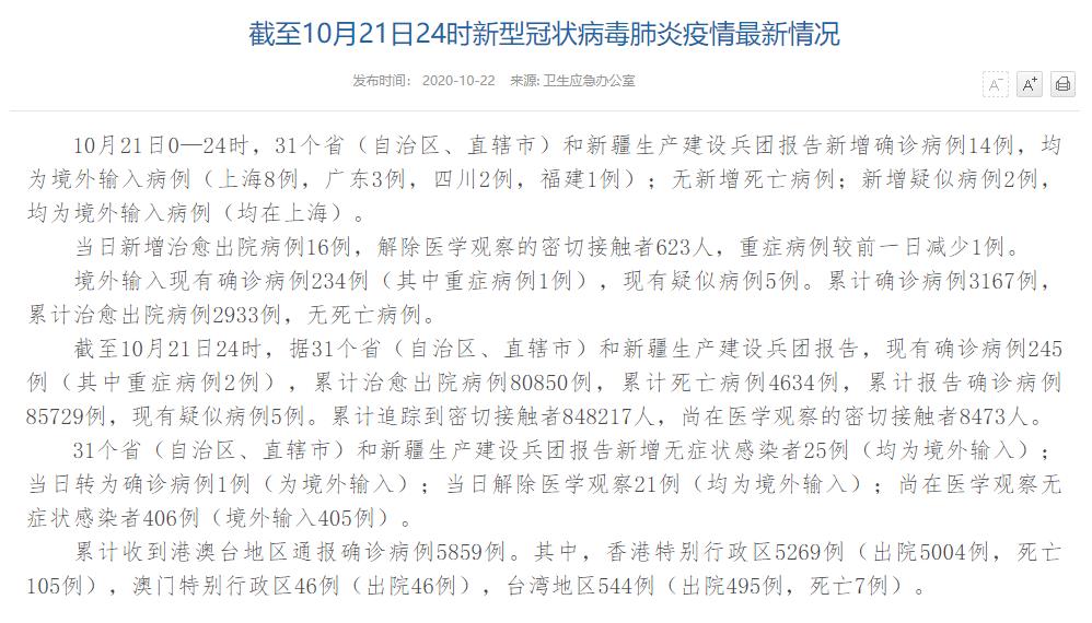 情況顯示,截至10月21日24時(shí),據(jù)31個(gè)?。ㄗ灾螀^(qū)、直轄市)和新疆生產(chǎn)建設(shè)兵團(tuán)報(bào)告,現(xiàn)有確診病例245例(其中重癥病例2例),累計(jì)治愈出院病例80850例,累計(jì)死亡病例4634例,累計(jì)報(bào)告確診病例85729例,現(xiàn)有疑似病例5例。累計(jì)追蹤到密切接觸者848217人,尚在醫(yī)學(xué)觀察的密切接觸者8473人。
