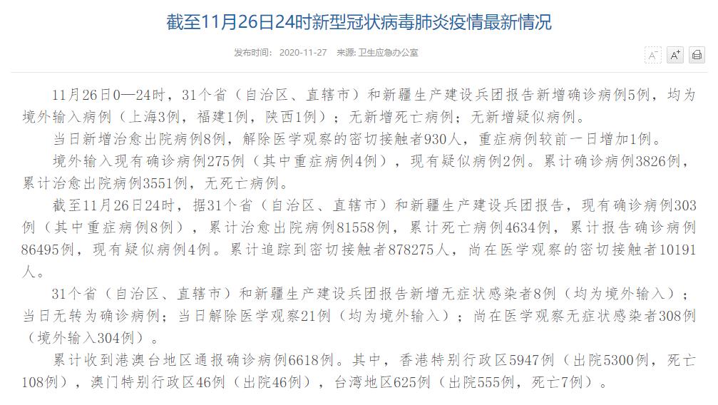 人民網(wǎng)北京11月27日電(董童)國家衛(wèi)生健康委于今日在官網(wǎng)發(fā)布的《截至11月26日24時(shí)新型冠狀病毒肺炎疫情最新情況》(以下簡稱“情況”)指出,11月26日0—24時(shí),31個(gè)?。ㄗ灾螀^(qū)、直轄市)和新疆生產(chǎn)建設(shè)兵團(tuán)報(bào)告新增確診病例5例,均為境外輸入病例(上海3例,福建1例,陜西1例);無新增死亡病例;無新增疑似病例。當(dāng)日新增治愈出院病例8例,解除醫(yī)學(xué)觀察的密切接觸者930人,重癥病例較前一日增加1例。