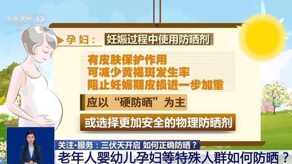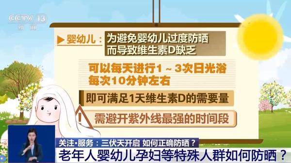 首都醫(yī)科大學(xué)宣武醫(yī)院皮膚性病科主任醫(yī)師 張海萍:首先要根據(jù)皮膚的表現(xiàn),如果只是有紅腫疼痛,可以用冷濕敷的方法,比如說在家里用一些冰牛奶或者說生理鹽水,倒在濕布上面,濕敷在皮膚表面,這樣反復(fù)幾次就有效緩解皮膚的紅腫反應(yīng)。如果曬傷比較厲害,出現(xiàn)了水皰甚至大皰的時(shí)候,就要及時(shí)到醫(yī)院請(qǐng)醫(yī)生幫您診治,以免感染。 老年人、嬰幼兒、孕婦等特殊人群如何防曬? 醫(yī)務(wù)人員還提示,夏季,嬰幼兒、老年人、孕婦等特殊人群更應(yīng)該注重合理防曬,促進(jìn)身體健康。 老年人:作為骨質(zhì)疏松高發(fā)人群,老年人一定要接受適宜的陽光照射。采取合理的防曬措施可減緩皮膚衰老,預(yù)防日光性角化、基底細(xì)胞癌等皮膚腫瘤的發(fā)生。但要注意,長時(shí)間在陽光下活動(dòng),仍需采取一定的防曬措施。