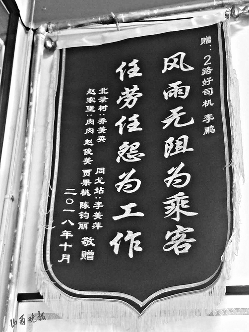 撿到東西歸還失主,失主送來表揚(yáng)信比較常見,山西晚報(bào)記者發(fā)現(xiàn)有一張比較例外。一位署名“2路乘客”的感謝信中這樣寫道:“2017年以前,可以說偶爾坐2路,因?yàn)榻?jīng)常會有等不上車的情況。但自從李鵬接上2路以后,基本上沒出現(xiàn)過等不上車的情況……作為長期乘坐公交的乘客真心非常感謝……”錦旗是7名乘客集體送的,“風(fēng)雨無阻為乘客,任勞任怨為工作”,14個(gè)字,表達(dá)的是乘客對李鵬的認(rèn)可。