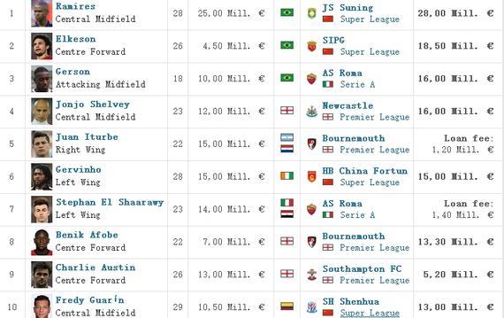 截至目前,中國俱樂部球員轉(zhuǎn)會費(含轉(zhuǎn)入及轉(zhuǎn)出)排名前10位的分別是拉米雷斯(2800萬歐元)、埃爾克森(1850萬歐元)、熱爾維尼奧(1500萬歐元)、高拉特(1500萬歐元)、保利尼奧(1400萬歐元)、登巴巴(1300萬歐元)、瓜林(1200萬歐元)、吉安(1200萬歐元)、畢津浩(1114萬歐元)、阿蘭(1110萬歐元),1100萬歐元轉(zhuǎn)會費的球員進不了前10位,這在一年之前是不可想象的。而像格烏瓦尼奧(1100萬歐元)、張鷺(980萬歐元)、孫可(920萬歐元)、巴里奧斯(850萬歐元)、吉爾(850萬歐元)、孔卡(820萬歐元)、奧古斯托(800萬歐元)、蒙蒂略(750萬歐元)、迪亞曼蒂(690萬歐元)都被擠出了前10位。