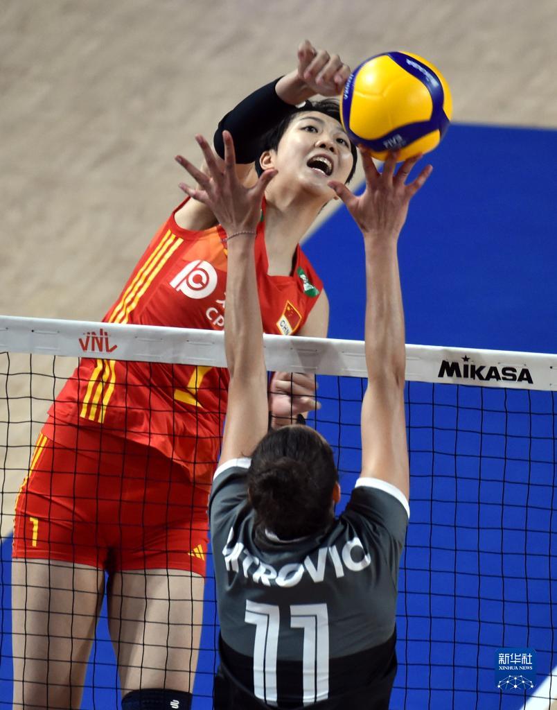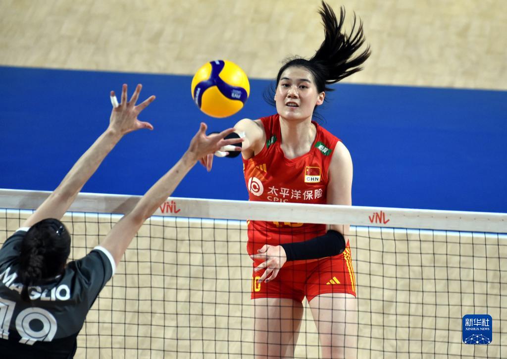 6月13日,中國隊球員袁心玥(上)在比賽中扣球。新華社記者盧炳輝攝