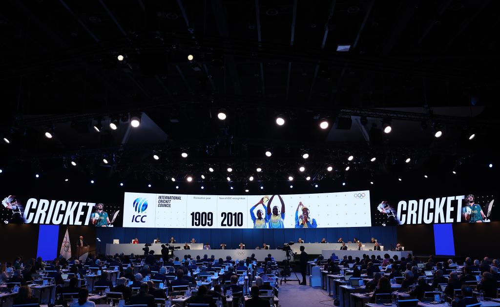 這是10月16日在印度孟買舉行的國際奧委會(huì)第141次全會(huì)現(xiàn)場大屏幕展示的板球項(xiàng)目。新華社記者 曹燦 攝