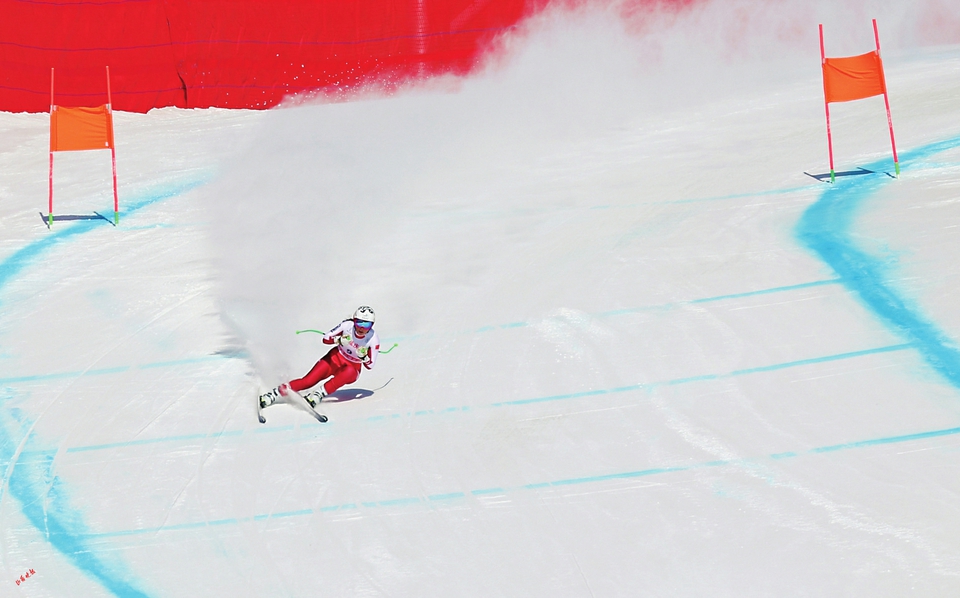 高山之巔,白雪之上,滑雪運動員在落差高達547米的雪道上滑降,他們穿行、回轉,快似閃電,如雪上飛燕。