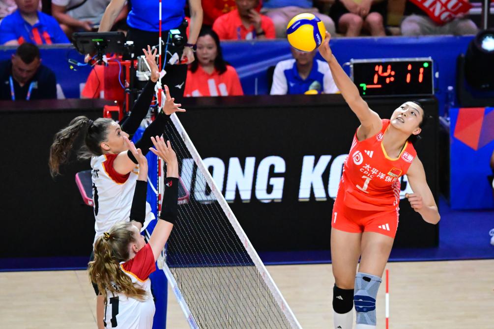 6月14日,中國(guó)隊(duì)球員袁心玥(右)在比賽中扣球。當(dāng)日,在世界女排聯(lián)賽中國(guó)香港站比賽中,中國(guó)隊(duì)3比0戰(zhàn)勝德國(guó)隊(duì)。新華社記者 朱煒 攝