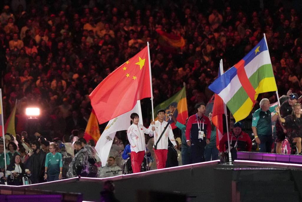 9月8日,巴黎殘奧會中國體育代表團旗手女子游泳運動員蔣裕燕(中左)和男子田徑運動員邸東東(中右)在閉幕式上入場。新華社記者 黃偉 攝