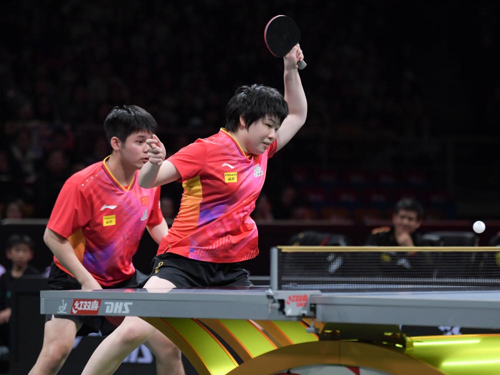 12月4日,中國(guó)隊(duì)組合林詩(shī)棟/蒯曼(右)在混雙比賽中。新華社記者 王曦 攝