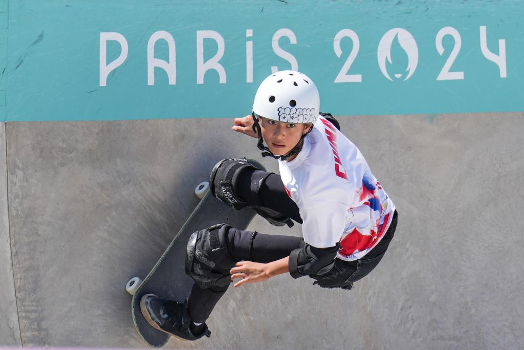 這是2024年8月6日,鄭好好在巴黎奧運(yùn)會(huì)滑板女子碗池預(yù)賽中。新華社記者 杜宇 攝
