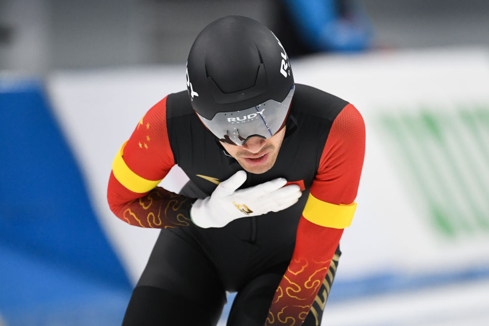 短道速滑運(yùn)動(dòng)員梁文豪高舉國(guó)旗
