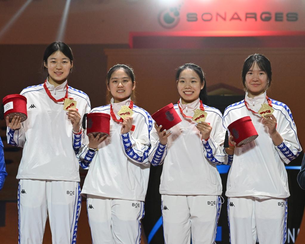 余思涵、楊靜雯、唐君瑤、施悅馨(左至右)慶祝勝利。圖片來源:國際劍聯(lián)官網(wǎng)