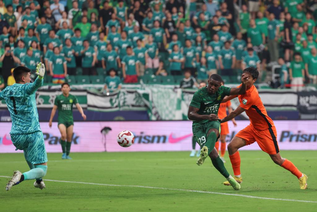 6月30日,北京國安隊(duì)球員法比奧(右二)在比賽中射門得分。新華社記者 胡星宇 攝