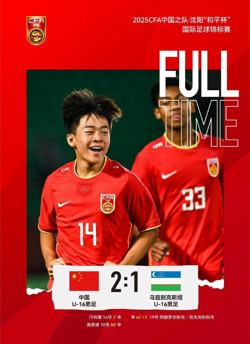 新華社沈陽7月6日電(記者 劉藝淳)6日,2025CFA中國之隊·沈陽“和平杯”國際足球錦標(biāo)賽次輪在沈陽城市體育場舉行,憑借周雨諾最后時刻的遠射破門,中國U16男足完成“準(zhǔn)絕殺”,以2:1力克烏茲別克斯坦隊,保留爭冠希望。