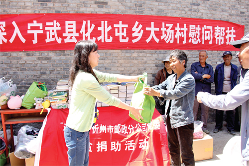 據(jù)悉,大場村距離寧武縣城約40 公里,由于地處山區(qū),經濟和交通狀況較差。自2009 年以來,市郵政分公司每年指派專人在該村定點幫扶,募集款物捐助困難群眾,受到了當?shù)卣腿罕姷囊恢潞迷u。圖為捐贈現(xiàn)場。(魯明強 趙崇凱 攝影報道)