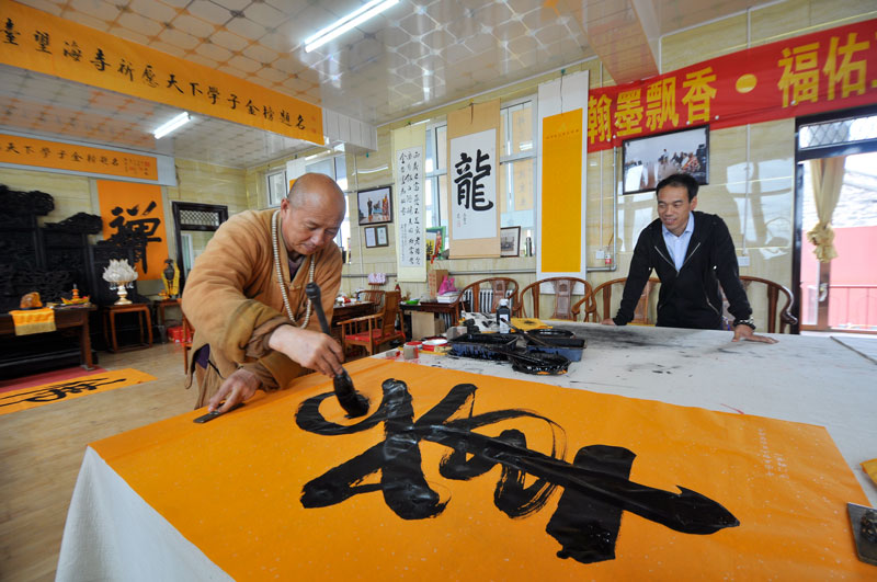 29日,中國佛教講經(jīng)交流會(huì)在五臺山召開之際,記者走訪了東臺頂望海寺釋覺一法師,他在勤修佛法的同時(shí)在書畫藝術(shù)上也自成一家。他認(rèn)為,佛法與書畫關(guān)系密切相通之處,學(xué)習(xí)佛法可促進(jìn)書法境界的提升,有助于佛法的弘揚(yáng)。