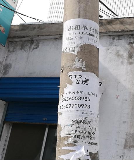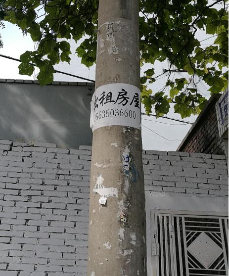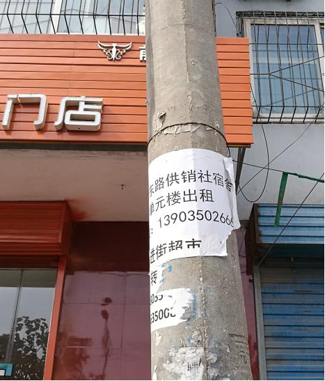 健康街南巷九龍?jiān)沸^(qū)附近電線桿出租房小廣告(吳瓊 攝)