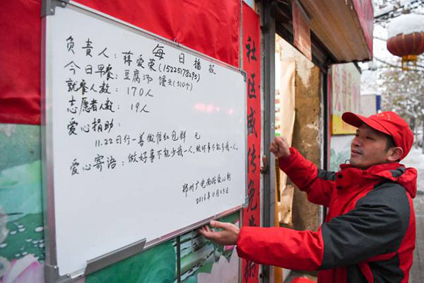 圖說(shuō):志愿者在懸掛“每日播報(bào)”,將早餐內(nèi)容、就餐人數(shù)等信息公布在愛心粥屋門口(11月23日攝)。圖片來(lái)源:新華社
