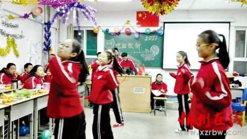 聯(lián)歡會由各班學生自己精心組織、排練,并由學生自主開展。同學們熱情高漲,積極參與,充分發(fā)揮自己的特長,表演自己最拿手的節(jié)目。每位同學都積極參與,每個人都成了“明星大腕”。班級聯(lián)歡會內容豐富、精彩紛呈,舞蹈、歌曲、相聲、小品、游戲等節(jié)目一一亮相,喜慶祥和的氛圍濃厚強烈。圖為初二210班學生正在進行節(jié)目表演。(郝江峰 攝)