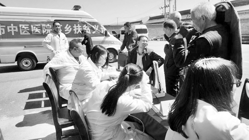 胡家溝村有貧困戶80戶。市委老干部局從2015年開始進(jìn)行幫扶,緊緊圍繞“一戶一名技術(shù)工,做好精準(zhǔn)扶貧”的工作思路,在技能培訓(xùn)、項(xiàng)目實(shí)施、基礎(chǔ)建設(shè)、教育援助、文藝活動(dòng)等方面開展了大量卓有成效的工作,在2016年底取得了整村脫貧的好成績。這次健康扶貧行動(dòng),是市委老干部局認(rèn)真貫徹全市脫貧攻堅(jiān)大會(huì)精神,鞏固成績、持續(xù)發(fā)力,不斷推進(jìn)幫扶成果的具體體現(xiàn)。針對村民對疾病預(yù)防和治療方面的需求,市委老干部局聯(lián)系市中醫(yī)院組織了義診活動(dòng)。市中醫(yī)院內(nèi)科、外科、心內(nèi)科等多個(gè)科室的9名醫(yī)務(wù)骨干和老專家,為貧困村民把脈問診、開方治療,使106名村民得到診療。