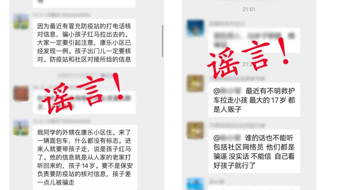 近日,本地微信群傳播:“最近有冒充防疫站的打電話核對(duì)信息,騙小孩紅馬拉出去的。大家一定要引起注意,康樂(lè)小區(qū)已經(jīng)發(fā)現(xiàn)一例”、“最近有不明救護(hù)車(chē)?yán)咝『?,最大?7歲,都是人販子”。