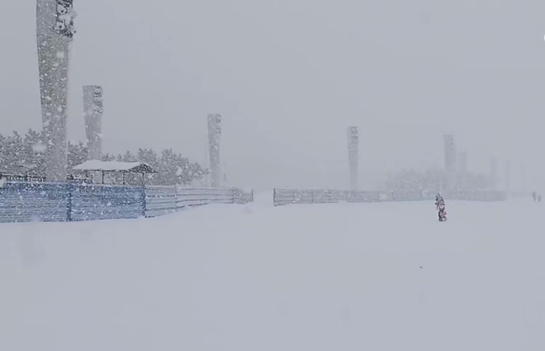 煙臺(tái)大學(xué)東門附近,冷流雪正在狂暴,宛如北極科考。微博網(wǎng)友視頻截圖