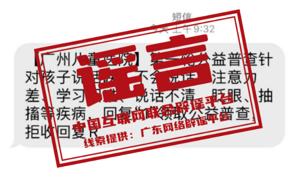 真相:近期,有社會醫(yī)療機(jī)構(gòu)冒用廣州市婦女兒童醫(yī)療中心(以下簡稱“廣州婦兒中心”)名稱,通過群發(fā)短信的方式,宣傳該中心正在進(jìn)行“身高普查”“針對孩子說話晚,不會說話、注意力差等”等公益普查項(xiàng)目。對此,廣州婦兒中心發(fā)布聲明稱,目前,該中心未就上述公益普查項(xiàng)目與其他任何醫(yī)療機(jī)構(gòu)或社會組織存在合作關(guān)系,也未曾通過短信、電話向廣大患者推送過醫(yī)療信息。特此提醒廣大市民,切勿輕信此類信息,并注意保護(hù)個人隱私。(來源:廣東省互聯(lián)網(wǎng)舉報(bào)中心)