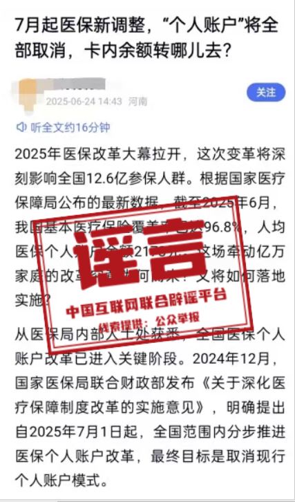 辟謠:警惕!“醫(yī)?!畟€人賬戶’將全部取消”系舊謠新傳