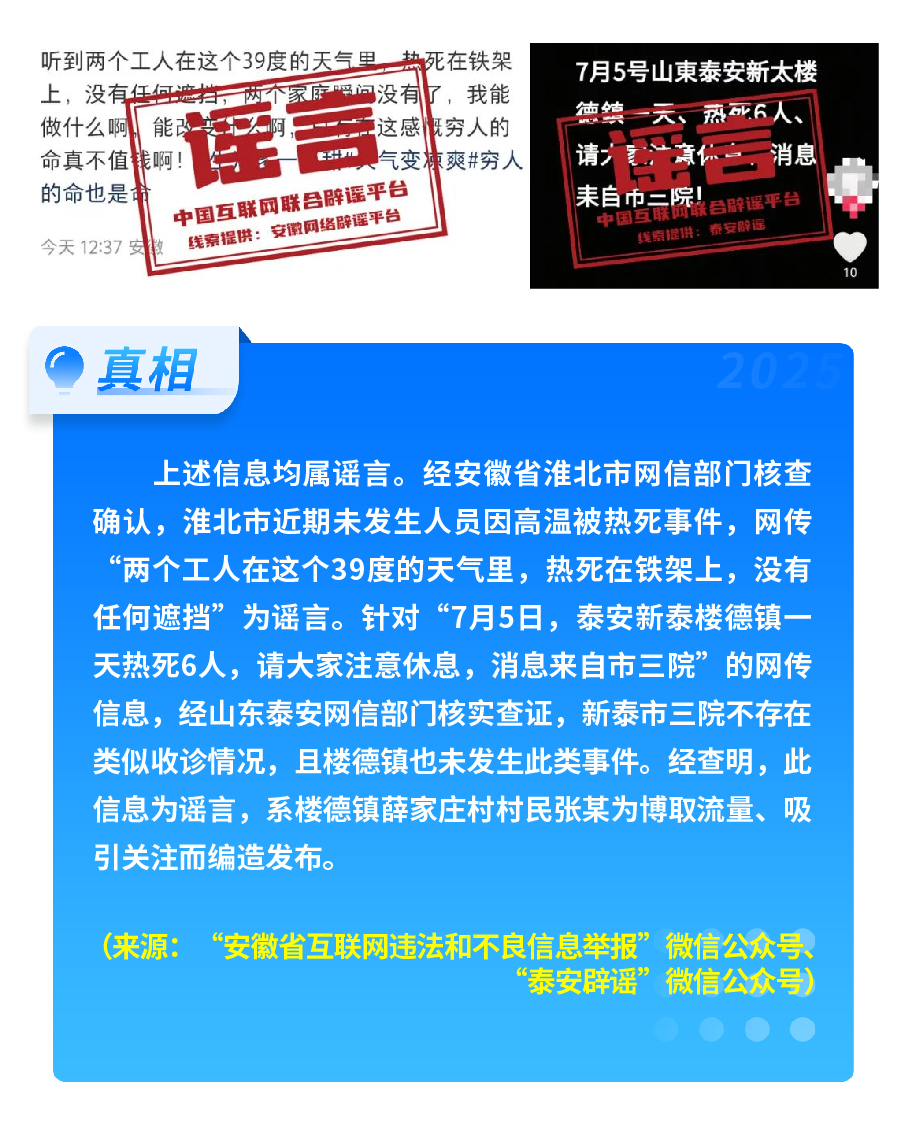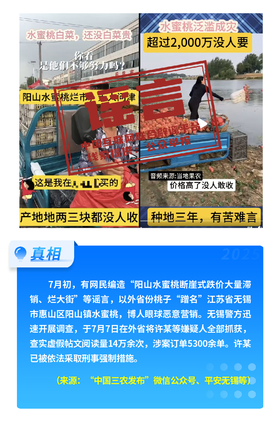 翻炒醫(yī)保舊謠 謊報(bào)地震預(yù)警 偽造警情通報(bào) 網(wǎng)信、公安嚴(yán)打自媒體發(fā)布不實(shí)信息 7月網(wǎng)絡(luò)謠言主要集中在公共政策、突發(fā)事件、社會(huì)民生等領(lǐng)域,假冒權(quán)威、憑空捏造,使用AI合成不實(shí)圖片和視頻,誤導(dǎo)公眾認(rèn)知,污染網(wǎng)絡(luò)生態(tài)。網(wǎng)信、公安等部門(mén)重拳出擊,堅(jiān)決打擊。 有人重新翻炒“醫(yī)?!畟€(gè)人賬戶(hù)’將全部取消”舊謠,故意歪曲醫(yī)保改革真實(shí)內(nèi)涵,嚴(yán)重誤導(dǎo)公眾對(duì)醫(yī)保改革政策的理解?!坝袑?zhuān)人上門(mén)服務(wù)激活醫(yī)保碼”,披著“公共服務(wù)”的外衣,實(shí)有詐騙之嫌和安全風(fēng)險(xiǎn)。憑空捏造“海南規(guī)定電動(dòng)自行車(chē)充電不能過(guò)夜、頭盔分三季”這一“奇葩規(guī)定”,以“新規(guī)”話術(shù),擾亂交通管理秩序。 近期,網(wǎng)上接連出現(xiàn)發(fā)布虛假“警情通報(bào)”的惡性造謠傳謠案件,炮制傳播“昆明駕車(chē)撞人案131人死亡”“杭州自來(lái)水接入糞水”及涉釋永信虛假“警情通報(bào)”,模仿“藍(lán)底白字”格式,杜撰聳人聽(tīng)聞細(xì)節(jié),損害政府公信力,嚴(yán)重?cái)_亂社會(huì)秩序?!霸菏款A(yù)測(cè)廣東將發(fā)生8級(jí)以上大地震”公然偽造專(zhuān)家聊天截圖,謊報(bào)地震預(yù)警。還有造謠者借盛夏高溫酷暑與洪澇災(zāi)害,編造“安徽淮北、山東泰安等地多人因高溫死亡” “重慶大暴雨導(dǎo)致15人死亡、4人失蹤”等謠言,蹭炒熱點(diǎn)、煽動(dòng)情緒。 此外,7月份正值暑期旅游旺季和水果等農(nóng)產(chǎn)品收獲季,有自媒體、商家借機(jī)編造傳播涉文旅及農(nóng)產(chǎn)類(lèi)謠言,干擾市場(chǎng)秩序,侵害消費(fèi)者權(quán)益。有商家違規(guī)使用人民大會(huì)堂建筑圖片標(biāo)識(shí)和名稱(chēng),仿冒人民大會(huì)堂賬號(hào),非法售賣(mài)、倒賣(mài)參觀門(mén)票,損害游客權(quán)益。個(gè)別商家剪輯發(fā)布“江蘇無(wú)錫陽(yáng)山水蜜桃斷崖式跌價(jià)、大量滯銷(xiāo)、爛大街”謠言視頻,再借機(jī)兜售假冒的陽(yáng)山水蜜桃,博人眼球惡意營(yíng)銷(xiāo),擾亂市場(chǎng)秩序。所謂“峨眉山人猴大戰(zhàn),游客墜崖,猴王被當(dāng)場(chǎng)擊斃”景區(qū)安全事件一度傳得沸沸揚(yáng)揚(yáng),相關(guān)視頻以驚悚情節(jié)博取關(guān)注,畫(huà)面實(shí)際是用AI合成拼接制作。 中央網(wǎng)信辦近日開(kāi)展“清朗·整治‘自媒體’發(fā)布不實(shí)信息”專(zhuān)項(xiàng)行動(dòng),重點(diǎn)整治惡意蹭炒誤導(dǎo)公眾、多種手段歪曲事實(shí)、不做標(biāo)注以假亂真、專(zhuān)業(yè)領(lǐng)域信息不實(shí)等問(wèn)題。一段時(shí)間以來(lái),網(wǎng)信部門(mén)會(huì)同相關(guān)部門(mén)依法處置假冒仿冒新聞媒體、政府機(jī)構(gòu)、企事業(yè)單位賬號(hào)3008個(gè),形成有力震懾;公安機(jī)關(guān)依法嚴(yán)厲查處造謠傳謠違法行為,上述傳播虛假“警情通報(bào)”以及“院士預(yù)測(cè)廣東將發(fā)生8級(jí)以上大地震”“海南規(guī)定電動(dòng)自行車(chē)充電不能過(guò)夜”“重慶大暴雨致15人死亡、4人失蹤”等造謠傳謠者均已被公安機(jī)關(guān)依法予以嚴(yán)厲處罰。 (責(zé)任編輯:梁艷) |