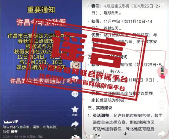 真相:近日,河南、安徽部分自媒體平臺發(fā)布關(guān)于中小學(xué)春秋放假的信息,聲稱“許昌市已被確定為河南中小學(xué)春秋假試點城市之一”“周口市中小學(xué)2025年秋假時間安排如下”“蕪湖市中小學(xué)將在11月12日至14日放首個秋假,連周末共5天”,引發(fā)關(guān)注。對此,河南許昌、周口及安徽蕪湖教育部門作出回應(yīng):并無放秋假的安排,網(wǎng)傳消息均為謠言。中小學(xué)放假安排需嚴(yán)格遵循國家教育方針政策及當(dāng)?shù)亟逃块T的統(tǒng)一部署,結(jié)合本地教育教學(xué)實際統(tǒng)籌規(guī)劃。如需了解相關(guān)安排,請通過屬地教育部門官方網(wǎng)站,切勿輕信、傳播未經(jīng)官方確認(rèn)的“小道消息”。(來源:“清朗河南”微信公眾號、@大河網(wǎng)、安徽網(wǎng)絡(luò)辟謠平臺)