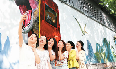 人們在“網(wǎng)紅打卡點”重慶永川恐龍3D藝術墻繪前留影。陳仕川攝 (人民圖片)